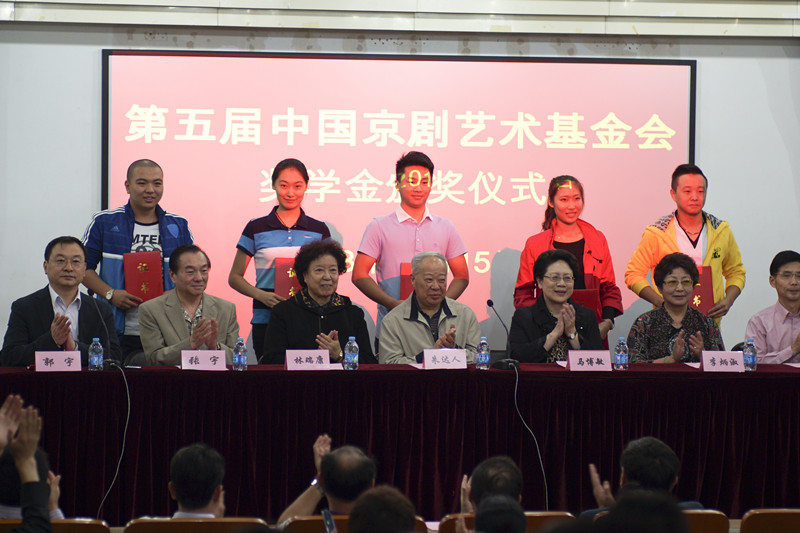 首先,郭校长介绍了出席本次颁奖仪式的领导与嘉宾以及中国京剧艺术基金会的概况。然后,基金会副理事长兼秘书长林瑞康女士宣布了本次获得“第五届中国京剧艺术基金会奖学金”学生名单(戏曲学院5名、戏曲学校5名)。随后,基金会领导和校领导向获奖学生颁发了证书并合影留念。