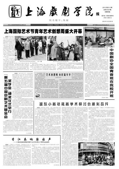 《上海戏剧学院报》2013年第10期(总第252期)已于2013年10月20日出版,本期共四版。重点内容有:《上海国际艺术节青年艺术创想周盛大开幕》、《中国剧协全国青音班在我校开班》、《国际小剧场戏剧学术研讨会顺利召开》、《“第五届中国京剧艺术基金会奖学金”颁奖仪式举行》等,本期第二、三、四版着重刊登了“第七届上海国际小剧场戏剧展演”活动中上演的7部剧目的评论和采访文章,敬请关注,也可点击下载阅读。(文、图、编辑:榕树)