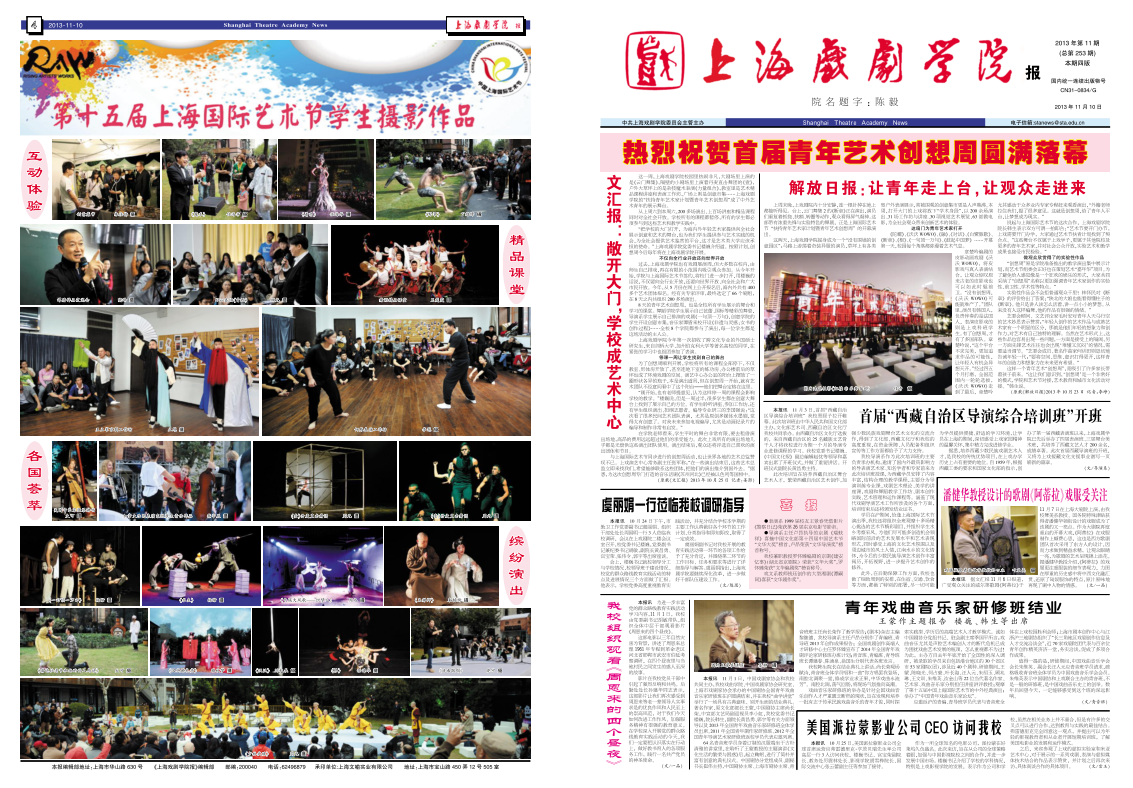 《上海戏剧学院报》2013年第11期(总第253期)已于2013年11月10日出版,本期彩版,共四版。重点内容有:《文汇报:敞开大门,学校成艺术中心》、《解放日报:让青年走上台,让观众走进来》、《首届“西藏自治区导演综合培训班”开班》、《虞丽娟一行莅临我校调研指导》等,本期第二、三、四版着重刊登了“首届青年艺术创想周”活动的评论文章、媒体报道、照片集锦等,敬请关注,也可点击下载阅读。(文、图、编辑:榕树)