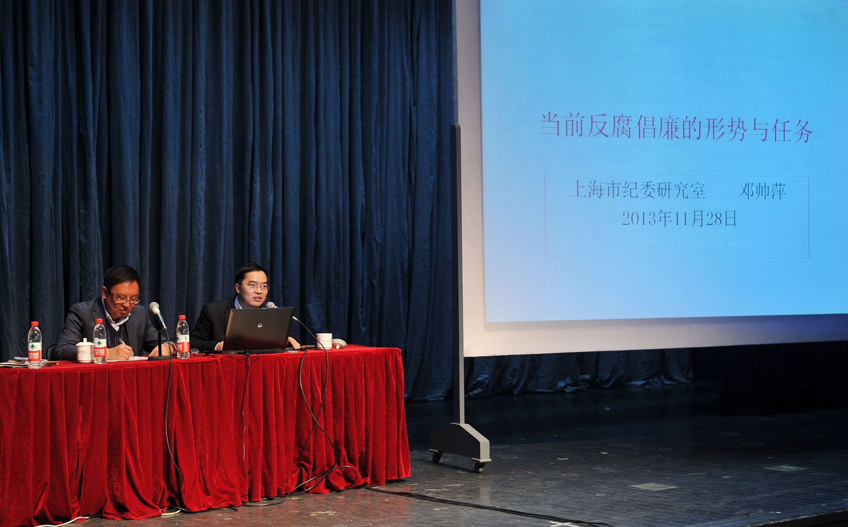 通报会后,上海纪委研究室主任邓帅萍就党风廉政问题向各位与会者作《当前反腐倡廉的形势和任务》的报告。他分别从政治、经济、文化三个方面深刻剖析了产生腐败的深刻原因,再次强调了反腐倡廉的重要意义,指出要更加科学有效地防治腐败,坚定不移把反腐倡廉建设引向深入。邓帅萍的报告数据翔实,案例生动,入情入理,使与会者受到了一次深刻的反腐倡廉形势任务和党风党纪教育,获得在场观众的好评。