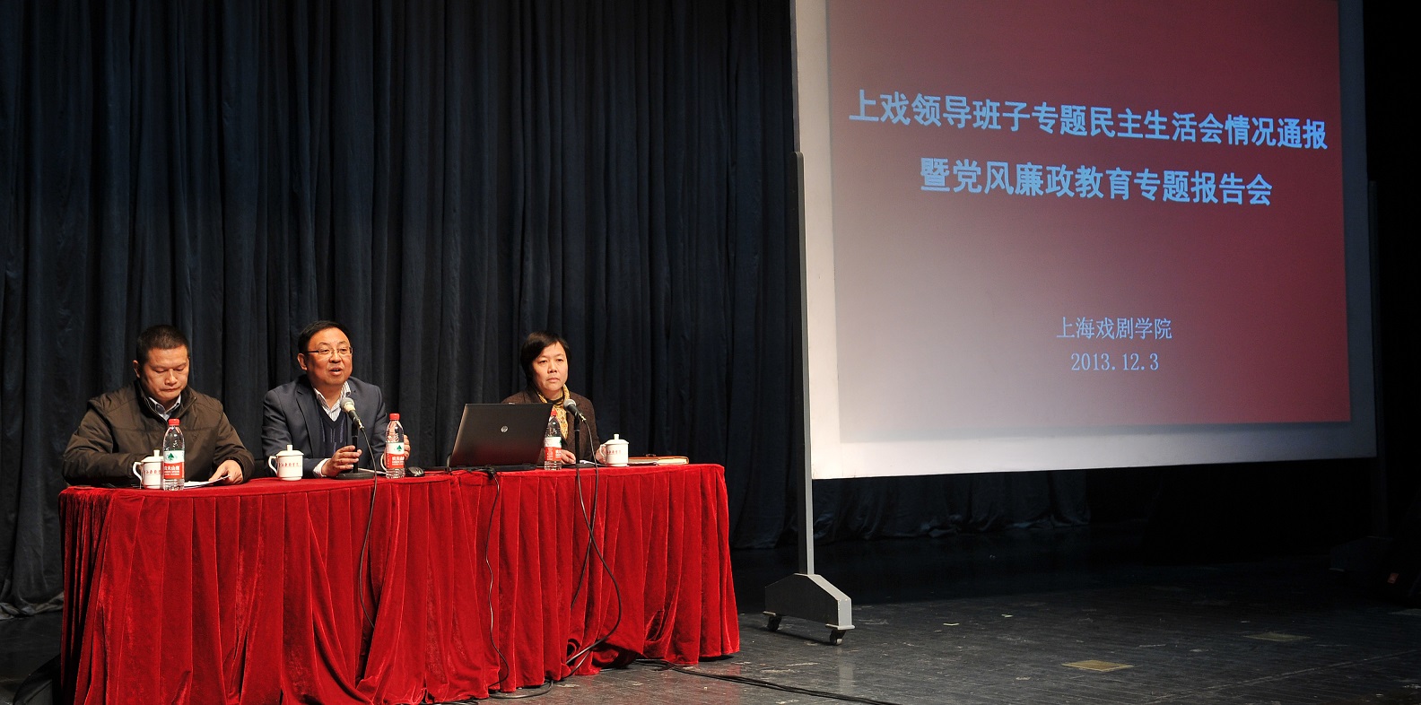 按照中央、市委、市教卫工作党委的要求和统一部署,12月3日下午,我校在端钧剧场召开党的群众路线教育实践活动专题民主生活会通报暨党风廉政报告会。校党委书记楼巍,市教卫党委第一督导组副组长陈荣武,校党委副书记胡敏,副院长黄昌勇、张伟令出席会议。全体中层干部、民主党派代表、离退休老同志代表、教授代表、校督导组成员以及师生代表参加会议。胡敏副书记主持会议。