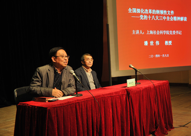 1月8日下午,上海社会科学院党委书记潘世伟同志在我校新空间剧场为中心组成员作十八届三中全会精神辅导报告。党委书记楼巍主持报告会,校领导和全体中层干部共计六十余人出席会议。