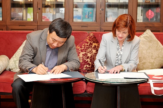 图为韩生院长与凯伦·古尔德院长签署合作意向书