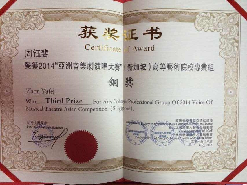 来自上海戏剧学院音乐剧中心2012级音乐剧班的周钰斐同学,在2014年8月中旬于新加坡举办的“亚洲音乐剧演唱大赛”(2014 Voice Of Musical Theatre Asian Competition)中,获得高等艺术院校专业组“铜奖”的优异成绩,这无疑是一件振奋人心的消息!这次国际大赛由国际音乐舞蹈交流促进会、新加坡国际华人艺术节组委会、亚洲音乐剧演唱大赛组委会共同主办,专业规格高、参赛人数多、比赛竞争激烈。周钰斐同学能够取得这样的好成绩,与学校领导的支持鼓励,音乐剧中心主任王洛勇老师、声乐指导陈冉老师的悉心教导是密不可分的!