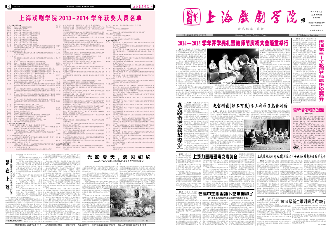 《上海戏剧学院报》2014年第9期(总第263期)已于2014年9月12日出版,本期套红,共四版。重点内容有:《2014—2015学年开学典礼暨教师节庆祝大会隆重举行》、《赵宝刚携<触不可及>与上戏学子热情对话》、《庆祝第三十个教师节师德座谈会召开》、《上戏力量再现南京青奥会》等。本期第三版选载了我校庆祝教师节座谈会发言。敬请关注,也可点击下载阅读。(文、图、编辑:榕树)