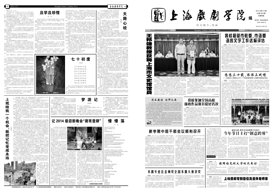 《上海戏剧学院报》2014年第10期(总第264期)已于2014年10月5日出版,本期共四版。重点内容有:《王邦雄教授获聘上海市文史馆馆员》、《我校接受市教委、市语委语言文字工作达标评估》、《悠悠三十载,浓浓上戏情——表演系84级校友入学三十年返校联谊暨84级教学座谈会举办》、《我校参加全国高校廉政作品赛并获好名次》等。本期第三版选载了我校辅导员谈艺术院校思政教育和队伍建设的论文。敬请关注,也可点击下载阅读。(文、图、编辑:榕树)