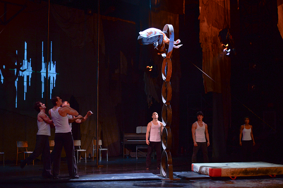 他们在地上撒白色粉末,演员在舞台上赤脚行走,只有一个女演员,虽然个子矮小但是十分灵活,高壮的男演员用一只手就能把女演员举起,女演员单脚站在男演员的手掌上,在高空也是脊梁笔挺毫不畏惧,男演员可以把女演员抛向空中转几个圈却仍然稳稳接住。