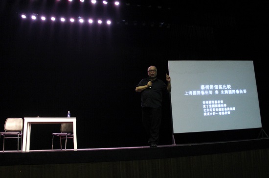 对于正在上戏校园内举办的上海国际艺术节创想周这一活动,身为教授的他把讲座的题目恰当好处地定为谈艺术节的发展,能让在场的听众和艺术家们都引起共鸣。什么是艺术节?这样简单的一个问题却一下子难倒了在场的听众。我们也许会觉得,艺术节就是玩,就是一天的游乐园,就是让你能见到很多艺术品的节日。而荣念曾把它的本质抽离了出来:艺术节很多时候是一种艺术的买卖,它应当有活动,有反思。他举出世博的例子,让我们理解艺术节平台如何建立的重要性。应它本身的组成出发,到理念,到方向,再到结构。这样一位艺术家,也用他的身体力行给我们示范了如何解决艺术节现状与挑战。