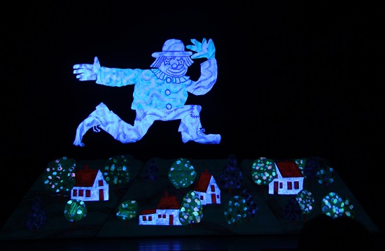 全剧分为三个部分,第一幕《小小的云》,在黑色幕布上,天蓝色发着光的小云彩千变万化,像绵羊,像飞机,还有鲨鱼,兔子,小丑......让人目不暇接,眼花缭乱,最后融汇成一大片厚重的雾霭,下起淅沥沥的小雨。孩子们的惊奇欢呼不绝于耳,不得不赞叹道具的逼真鲜活,直观风趣。