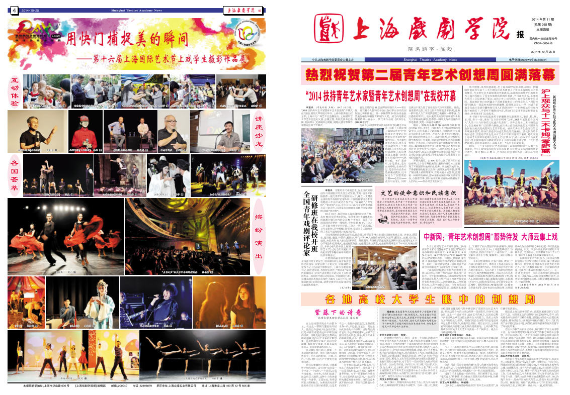 《上海戏剧学院报》2014年第11期(总第265期)已于2014年10月25日出版,本期彩版,共四版。重点内容有:《“2014扶持青年艺术家暨青年艺术创想周”在我校开幕》、《全国青年戏剧评论家研修班在我校开班》、《各地高校大学生眼中的创想周》等。敬请关注,也可点击下载阅读。(文、图、编辑:榕树)