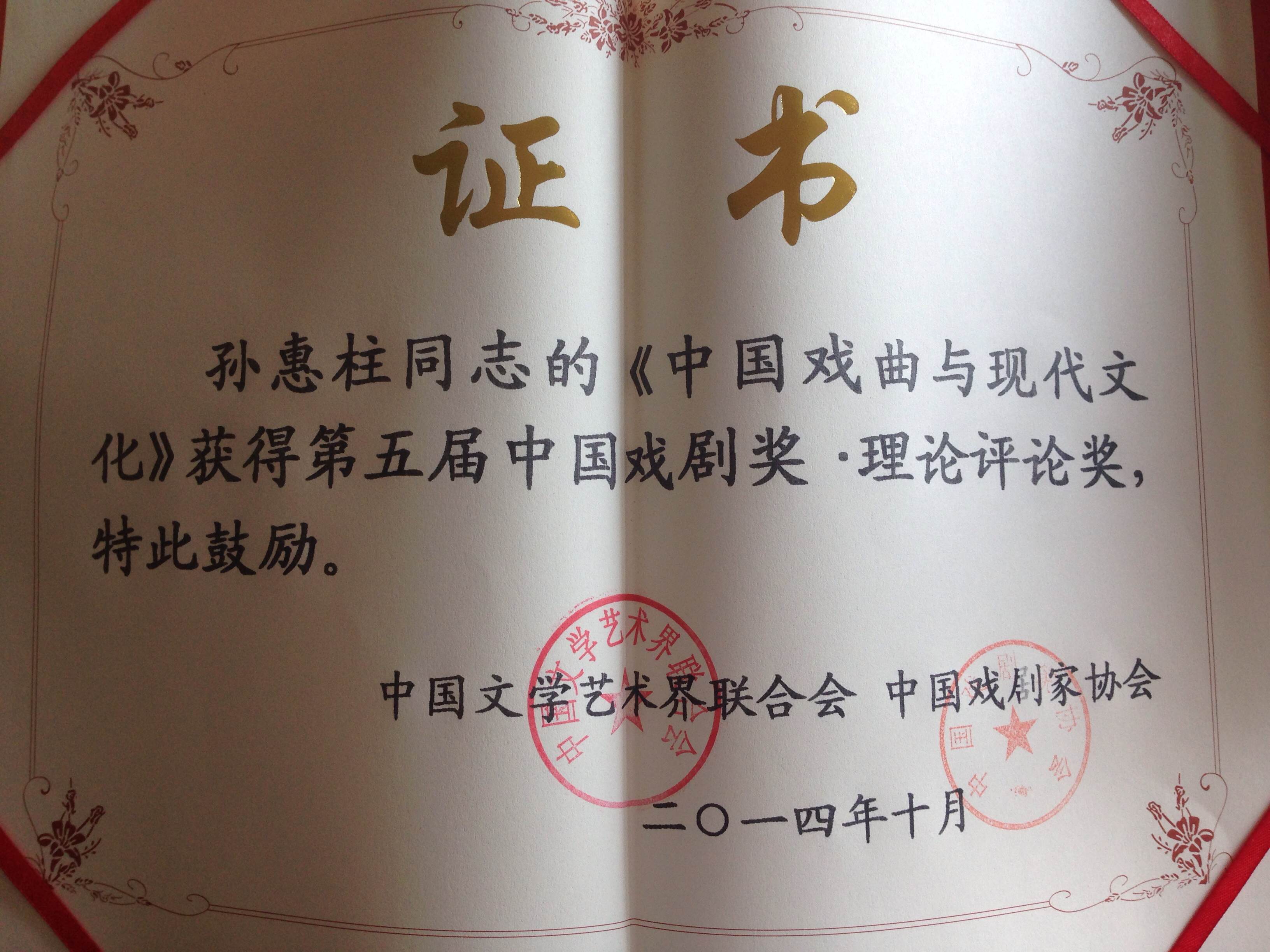近日,我校孙惠柱教授的论文《中国戏曲与现代文化》荣获第五届中国戏剧奖·理论评论奖。(文、编辑:榕树)