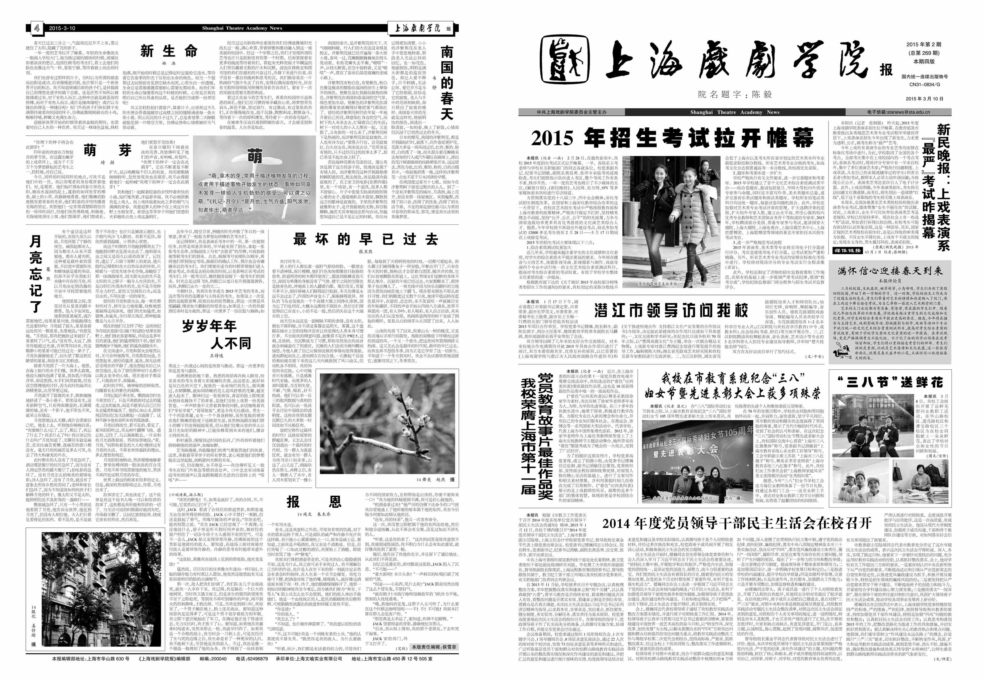 《上海戏剧学院报》2015年第2期(总第269期)已于2015年3月10日出版,本期共四版。重点内容有:《2015年招生考试拉开帷幕》、《潜江市领导访问我校》、《我校荣膺上海市第十一届党员教育故事片最佳作品奖》、《我校在市教育系统纪念“三八”妇女节暨先进表彰大会上获多项殊荣》、《2014年度党员领导干部民主生活会在校召开》等。敬请关注,也可点击下载阅读。