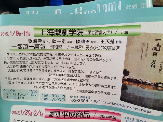 1月9日至11日,上海戏剧学院学生作品《一句顶一万句》(小说原著刘震云,编剧陈一诺,导演陈佳玮,剧本指导老师周豹娣)受邀于日本东京Tiny Alice小剧场戏剧节精彩呈现,并荣获该戏剧节最高奖项——评委会特别奖。