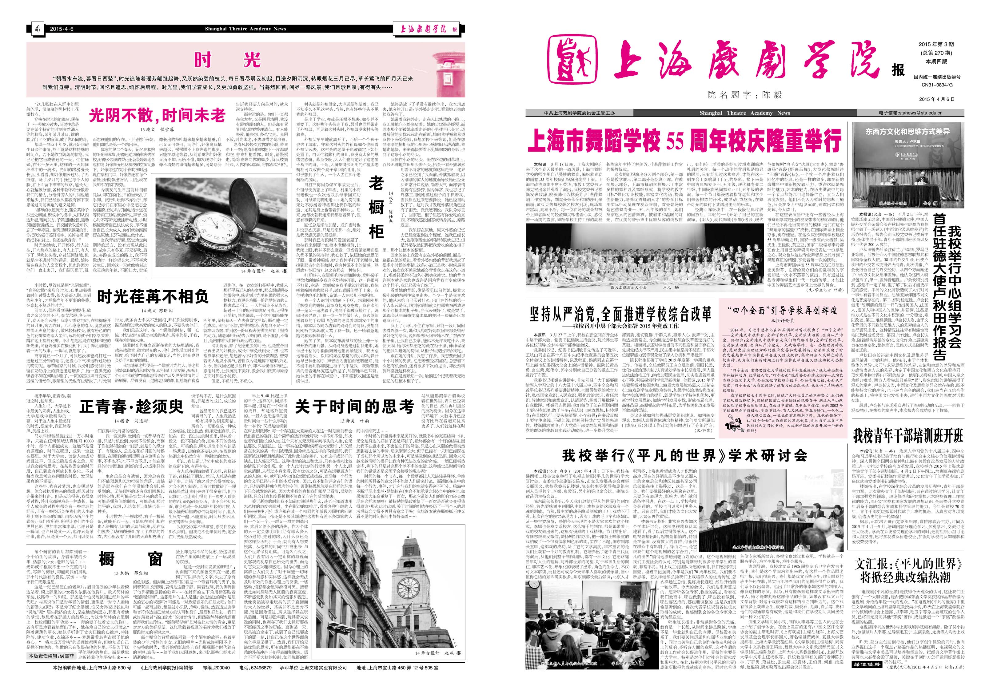 《上海戏剧学院报》2015年第3期(总第270期)已于2015年4月6日出版,本期共四版。重点内容有:《上海市舞蹈学校55周年校庆隆重举行》、《坚持从严治党,全面推进学校综合改革》、《我校举行中心组学习会》、《我校举行<平凡的世界>学术研讨会》、《我校青年干部培训班开班》等。敬请关注,也可点击下载阅读。