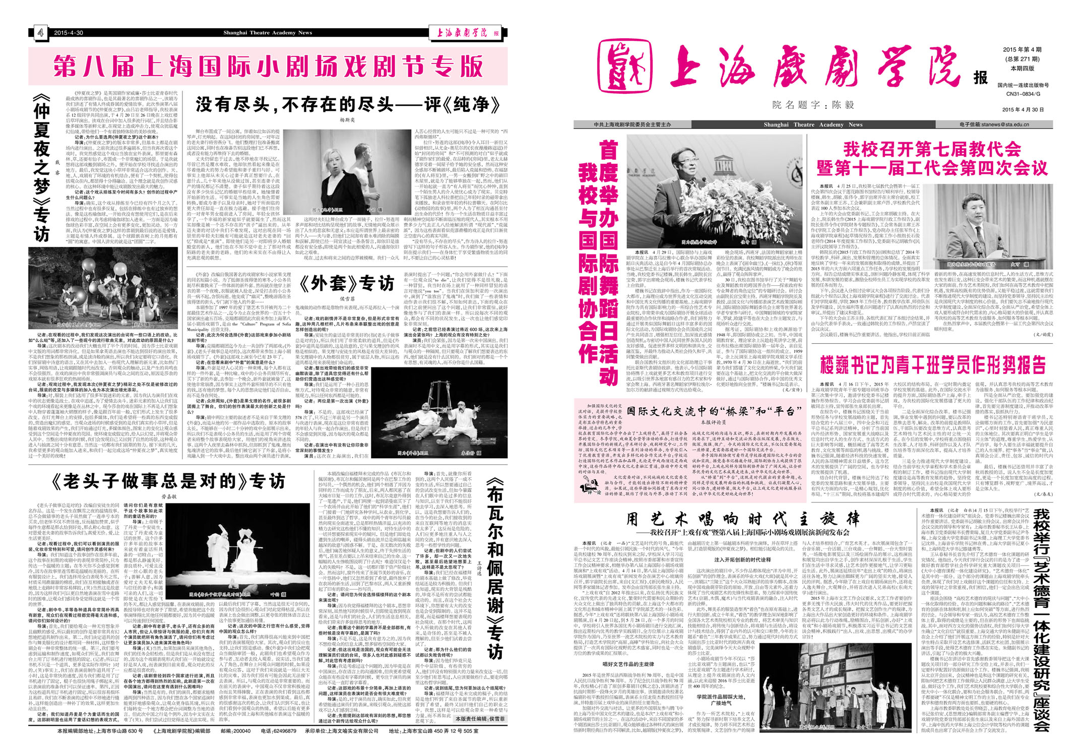 《上海戏剧学院报》2015年第4期(总第271期)已于2015年4月30日出版,本期共四版。重点内容有:《我校与国际剧协合作,首度举办国际舞蹈日活动》、《我校召开第七届教代会暨第十一届工代会第四次会议》、《楼巍书记为青干班学员作形势报告》、《用艺术唱响时代主旋律——我校召开“上戏有戏”暨第八届上海国际小剧场戏剧展演新闻发布会》、《我校举行“艺术德育一体化建设研究”座谈会》等。敬请关注,也可点击下载阅读。