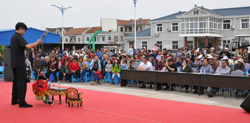 上午九点, 一段优美的群舞《秀色》拉开了文艺演出的序幕,整场演出形式喜闻乐见,内容贴近生活,受到父老乡亲的热烈欢迎。婉转动听的戏曲唱腔、活泼动感的舞蹈表演让老乡们看得津津有味,尤其是戏曲学院学生带来的木偶表演《钟馗醉酒》掀起了整场演出的一阵高潮,演员凭着手指灵活控制着纤细的悬丝,把钟馗的木偶动作表现得惟妙惟肖。本次演出还特别邀请了上海沪剧院的青年演员,他们带来了《江姐.红梅赞》、《十二月花名赋》、《罗汉钱.赠钱》、《燕燕做媒》、《办喜事》等经典的沪剧唱段,台下观众也跟着节拍随声附和,陶醉其中。穿插其中的互动问答环节也吸引了乡亲们踊跃参与,不论是白发苍苍的阿公阿婆,还是天真可爱的小朋友,他们质朴纯真的回答,博得观众阵阵鼓励的掌声,现场洋溢着一片浓浓的欢乐气氛。最后演出在一首沪剧唱段《昨夜情·为你打开一扇窗》的优美旋律中落下帷幕。