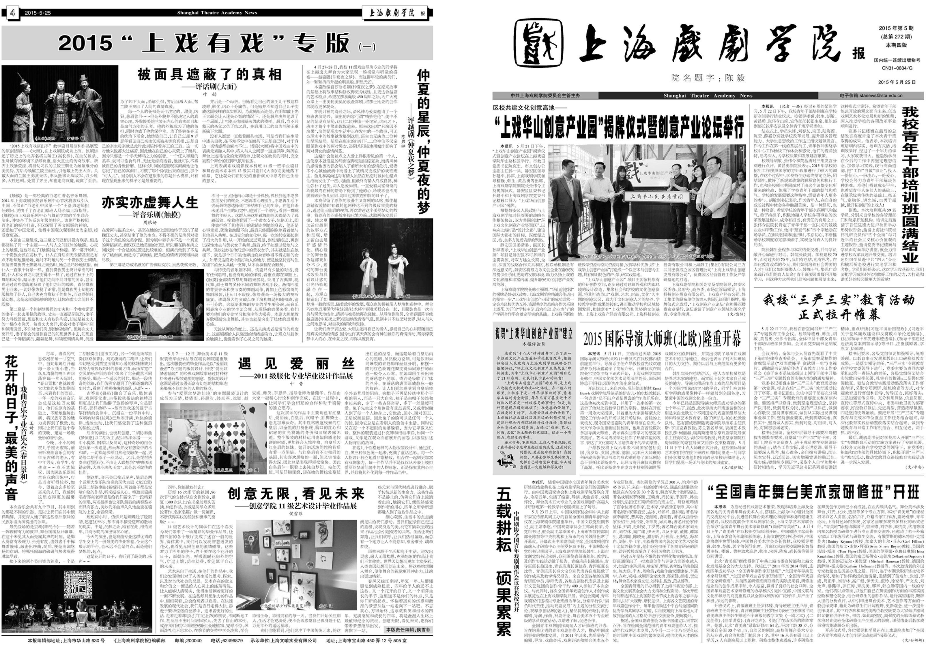 《上海戏剧学院报》2015年第5期(总第272期)已于2015年5月25日出版,本期共四版。重点内容有:《“上戏华山创意产业园”揭牌仪式暨创意产业论坛举行》、《2015国际导演大师班(北欧)隆重开幕》、《我校青年干部培训班圆满结业》、《“全国青年舞台美术家研修班”开班》等。敬请关注,也可点击下载阅读。