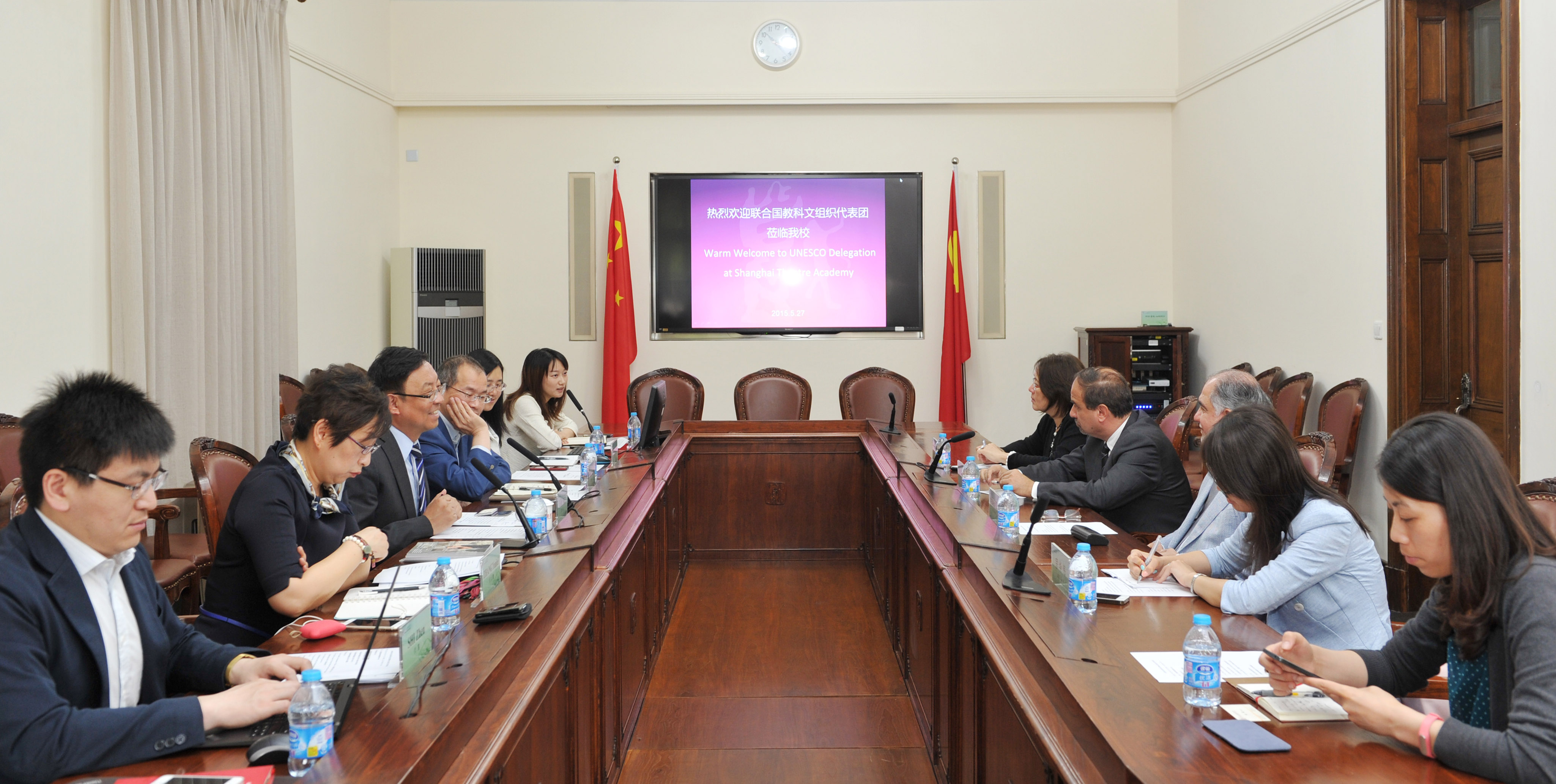 上海戏剧学院楼巍书记向代表团一行介绍了上戏70年发展历程以及在国际艺术交流与合作方面的情况。特别是国际剧协的总办事处从巴黎迁至上海后,上戏和国际剧协成功联合举办了国际舞蹈日庆典活动,今后,上戏还将携手国际剧协就更多艺术和教育项目进行交流。联合国教科文组织代表团对上戏在艺术教育和国际交流方面所取得的丰硕成果表示了赞许,并表示希望能够拓宽渠道,积极合作,支持上海戏剧学院更好地将中国的戏剧作品推向世界。