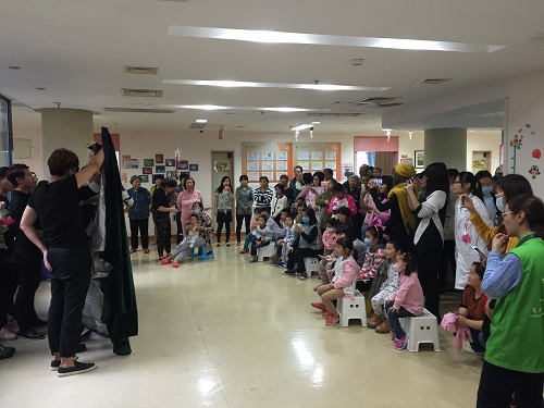 晚上六点,志愿者们结束了病房的公益服务后又来到了儿科医院的报告厅,并且与那里的孩子们一起过集体生日。木偶专业的志愿者们再次上演了精彩的节目:杖头木偶《诚实》教育孩子们诚信做人;创意木偶《魔巾》时而变成鸡斗时而变成舞者;而15级木偶的新生也加入到了志愿者队伍,他们动感的机械舞表演为现场增添了许多热情;人偶剧《乖宝贝》和提线木偶《训猴》更是将气氛推向了高潮,很多孩子都趴到了舞台上观看。最后在孩子们的热烈掌声和欢声笑语中落下了帷幕。