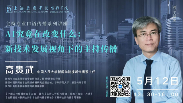 5月12日下午,由上海戏剧学院电影学院主办的本学期最后一次主持专业口语传播系列讲座在线上顺利开展,这也是浦江大讲堂的第三十六讲。讲座题为——“AI究竟在改变什么:新技术发展视角下的主持传播”,主讲人为中国人民大学新闻学院视听传播系主任、教授与博士生导师——高贵武。上海戏剧学院电影学院副院长董健出席讲座并致欢迎词,播音主持专业负责人费泳老师主持讲座。除电影学院主持专业学生外,讲座还吸引了不同专业的师生们参与其中,在高贵武教授的讲述下,与会者认真聆听、积极参与、气氛热烈。
