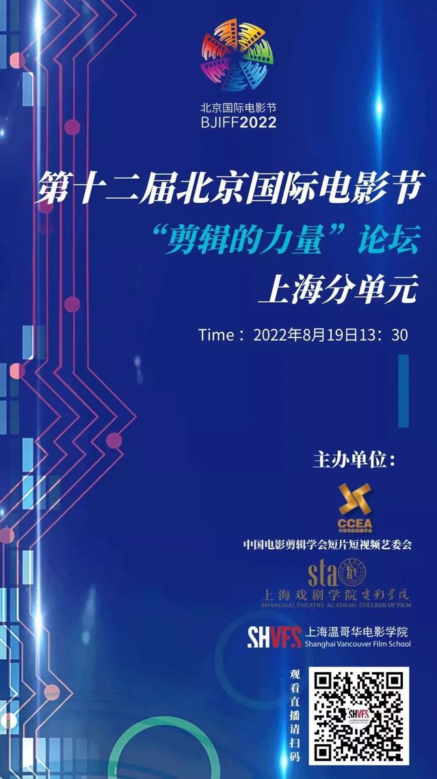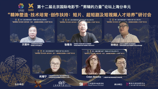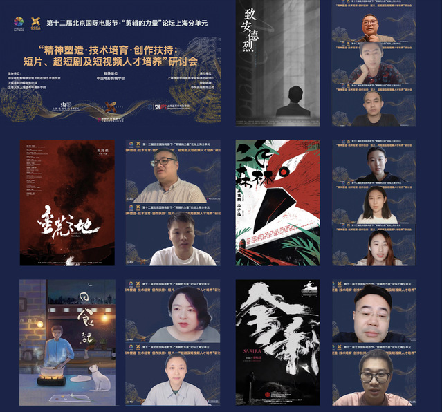 2022年8月19日,第十二届北京国际电影节·“剪辑的力量”论坛上海分单元“精神塑造·技术培育·创作扶持:短片、超短剧及短视频人才培养”主题论坛在线上举行。本次活动由中国电影剪辑学会短片短视频艺术委员会、上海戏剧学院电影学院、上海大学上海温哥华电影学院三方联合举办,邀请入选年度关注片单的部分短片短视频主创进行分享,与会专家学者就相关主题进行深入探讨和互动点评。