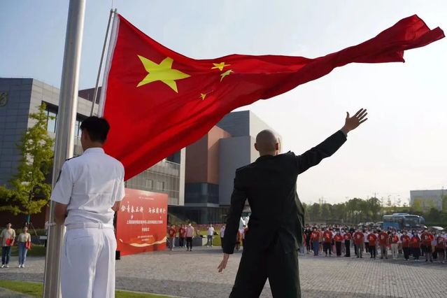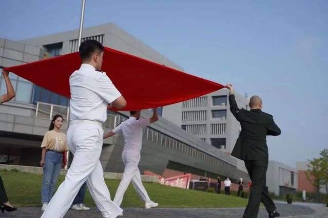 迎着晨光,从上戏走出的四位大学生退役士兵樊兴宇、黄圆圆、宋润达、邹亦凡迈着铿锵有力的步伐走向升旗台。在雄壮的国歌声,五星红旗冉冉升起,在蓝天下显得格外鲜艳,令在场师生无不心潮澎湃。