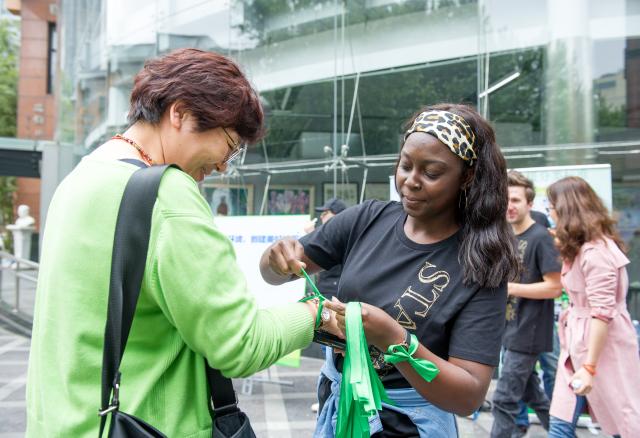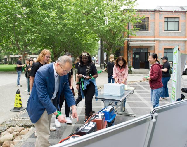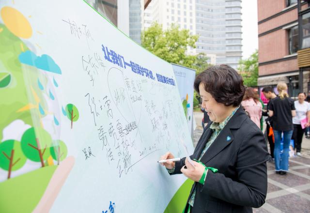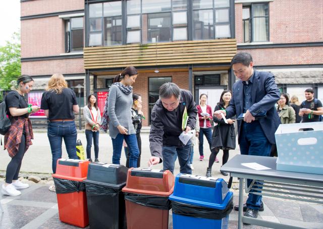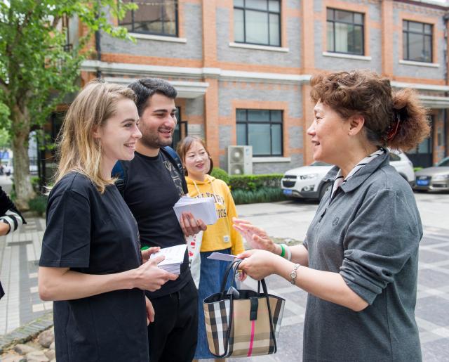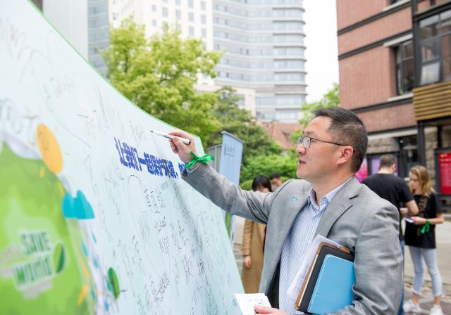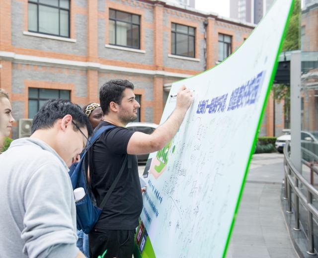 4月25日中午,党政第一支部的各位老师和上戏留学生们齐聚端钧剧场前,向来往的行人们主动科普垃圾分类常识。留学生们耐心地向师生们介绍生活中常见的各项垃圾该如何合理归类,分发印有绿色地球的爱心贴纸,并与大家互系绿丝带。为了使垃圾分类理念融入日常生活,根植于大家心中,师生们还被邀请参与了互动小游戏:对一张张印有生活各类常见垃圾的小贴纸进行分类判断,并贴到相应的“干垃圾”、“湿垃圾”、“可回收垃圾”、“有害垃圾”上。通过这样的互动,师生们对垃圾分类的理念有了更深刻的理解,很多人表示会“从我做起”、积极践行垃圾分类的责任和义务。最后,大家集体在“让我们一起保护环境、创建美好校园”的主题板上签名留念。