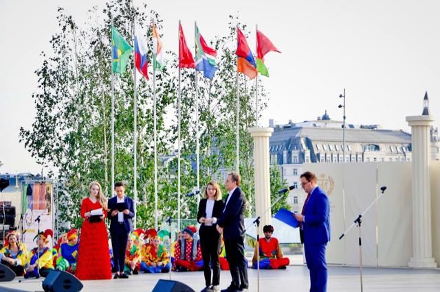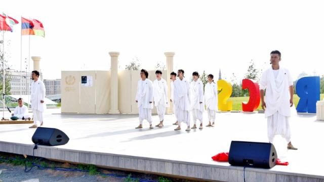 5月28日下午,戏剧节在克里姆林宫旁的科扎里亚季耶公园的露天剧场隆重举行,俄罗斯主办方带来了载歌载舞的民族表演。与会领导对到场的各国嘉宾表示了热烈欢迎,国际戏剧协会总干事托比亚斯也在开幕式上致辞,对金砖国家戏剧节的举办予以肯定。开幕式最后,各方团队上台,在介绍到我方代表团时,场上响起了《春节序曲》,我方团队和着音乐跳起了极具中华民族特色的舞蹈,引得现场各国演出团队纷纷学习,将现场气氛带到了高潮。