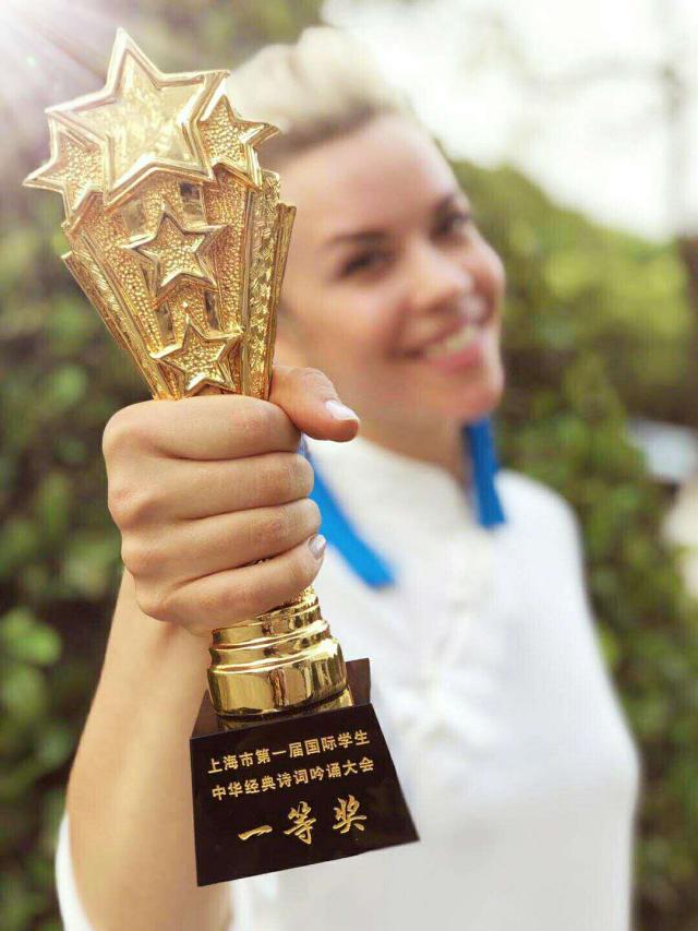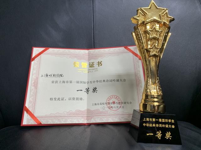 “呦呦鹿鸣,食野之苹。我有嘉宾,鼓瑟吹笙。”此次吟诵比赛中,我校留学生BARSUKOVA ALENA选择了《诗经.小雅.鹿鸣》作为吟诵的诗歌。一袭水墨淡蓝中式长衣,一出场便以一段京剧青衣念白牢牢吸引了众多观众的目光,配合现场乐队那旋律丰富、韵味悠长的伴奏,京剧念白忽又转变成深情吟唱,ALENA的发音字正腔圆,画面古风淳朴、古典韵味十足。整场演出形式别具一格,古典与现代交织,含蓄与激情碰撞,深深地打动着在场的观众和评委,经过激烈的角逐,我校与复旦大学并列,最终获得一等奖。