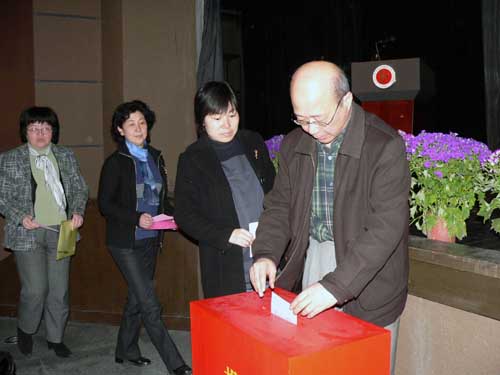图为代表对《上海戏剧学院行政工作报告》进行投票表决
