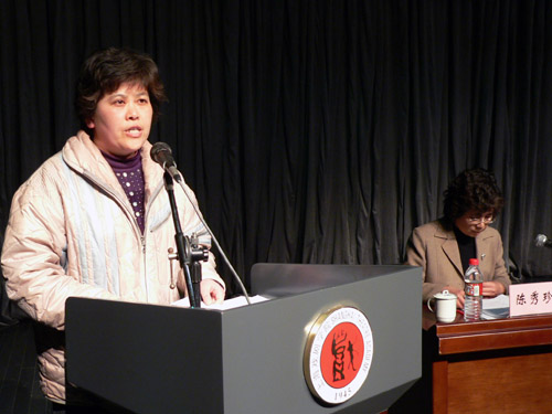 图为黄桂英老师代表党委系统讨论组发言