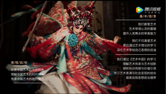 目前,《艺术中国》网络课程已经录制完成14节,分别由14为文化艺术领域大家讲授。每节课程时长约为40-50分钟,题目和授课专家分别为:缤纷华夏的思想之舞,楼巍讲授;源远流长的艺术中国,王邦雄讲授;现代作家的生活与创作,杨扬讲授;戏曲艺术中的情与理,刘庆讲授;且思且行的中国话剧,汤逸佩讲授;“东张西望”的中国戏剧,宫宝荣讲授;表演艺术与社会文明,王洛勇讲授;绘声如画的语言艺术,王苏讲授;中国女红的艺术精神,潘健华讲授;电影大国和电影强国,厉震林讲授;电视主持的表达之道,骆新讲授;礼仪和社会表演,孙惠柱讲授;观演期待的角色文化,张生泉讲授;新时代中国文化发展新愿景,黄昌勇讲授。从表演、戏剧、影视、社会表演、戏曲、舞蹈、文化等多个维度对艺术进行诠释。
