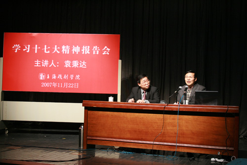十七大精神活动在党委领导下,好戏连台、高潮迭起。今天下午一点半,全体在职党员在端钧剧场举行了“学习十七大精神报告会”。市委党校教授、市委宣传部东方讲坛宣讲团成员袁秉达为我校广大党员作了学习辅导报告。我校党政领导葛朗、韩生、刘志钢等和全体在职党员、老同志党员代表、民主党派代表共计300人出席了会议。党委宣传部部长张生泉主持报告会。