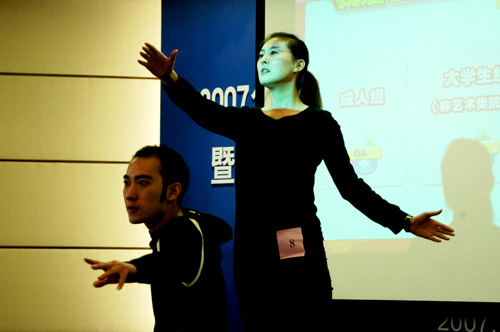 图为我校05级表演系郭彤彤同学与李金同学在朗诵,他们分别荣获本次比赛一、二等奖