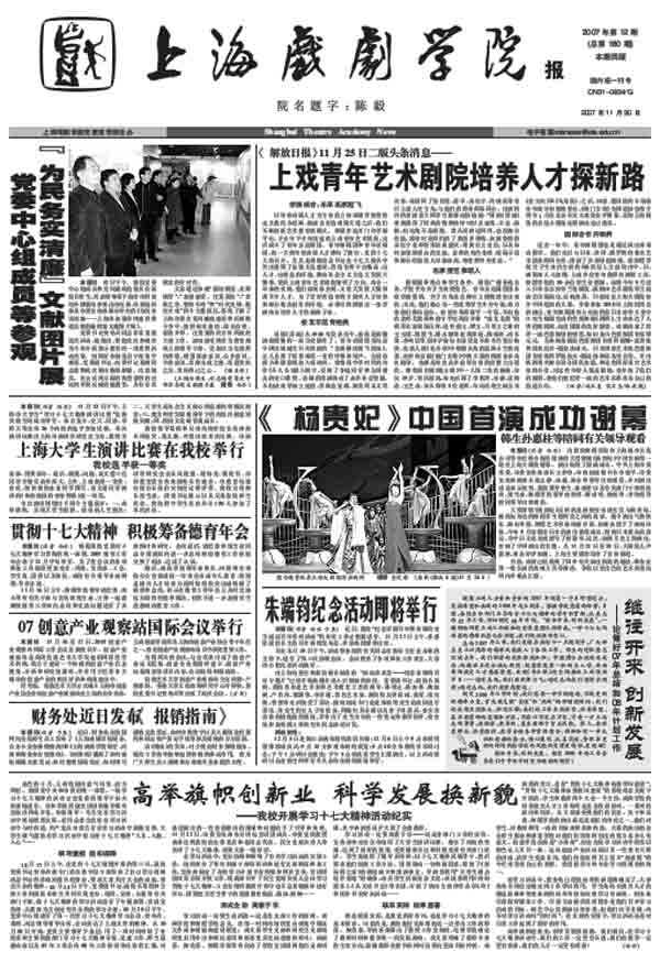 《上海戏剧学院报》2007年第12期(总180期)已出版。本期重点内容有:《党委中心组成员等参观“为民务实清廉”文献图片展》、《上戏青年艺术剧院培养人才探新路》、《上海大学生演讲比赛在我校举行