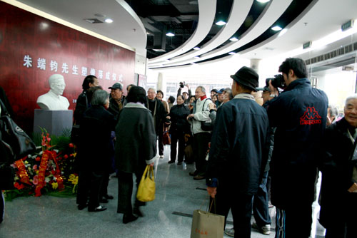 落成仪式结束后,来宾们参观了在端钧剧场大厅内陈设的纪念朱端钧先生诞辰百年展板,并纷纷与朱先生雕像合影留念,追思缅怀朱先生淡泊明志、傲骨平心的一生。