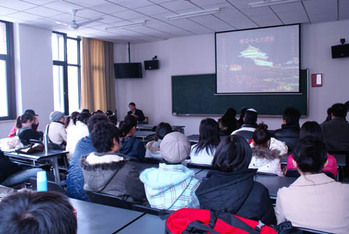 在讲座的最后,施老师结合我校是一所艺术类高等学府的实际情况谈到了十七大精神中关于文化工作的部分。十七大报告要求广大的文化工作者要在今后的工作中突出弘扬中华民族的传统文化,他希望我们的同学们在日后的学习工作中能坚持这一知道思想,为祖国的文化事业贡献自己的力量。