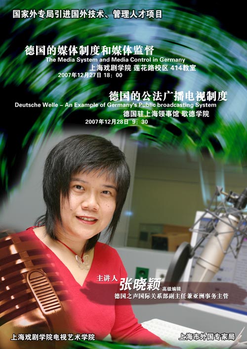 12月27日18时,德国之声国际关系部副主任兼亚洲事务主管、高级编辑张晓颖将赴我校莲花路校区414教室做题为 "德国的媒体制度和媒体监督"(The Media System and Media Control in Germany)专题讲座。该讲座由上海戏剧学院电视艺术学院、上海市外国专家局共同举办,为国家外专局引进国外技术、管理人才项目内容之一,敬请关注。