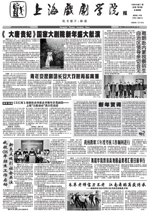 《上海戏剧学院报》2008年第1期已出版(总182期)已出版。本期重点内容有:《<大唐贵妃>国家大剧院新年盛大献演》、《葛朗赴内蒙视察招生自治区领导亲切会见》、《青年京昆剧团长安大戏院再掀高潮》、《我校08年招生工作启动 新亮点吸引社会关注》、《我校教职工年度考核工作顺利进行》、《舞蹈学院教育高地精品课程汇报日前举行》等,敬请关注。
