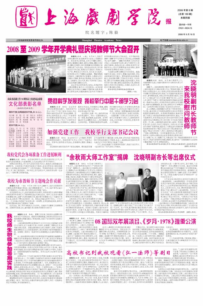 《上海戏剧学院报》2008年第8期已出版(总189期)已于9月18日出版。本期重点内容有:《2008至2008学年开学典礼暨庆祝教师节大会召开》、《沈晓明副市长教师节来我校慰问教师》、《我校党代会各项准备工作进展顺利》、《贯彻科学发展观 我校举行中层干部学习会》、《加强党建工作 我校举行支部书记会议》、《我校为市教师节主题晚会作贡献》、《我校师生积极参加暑期实践》等,敬请关注。