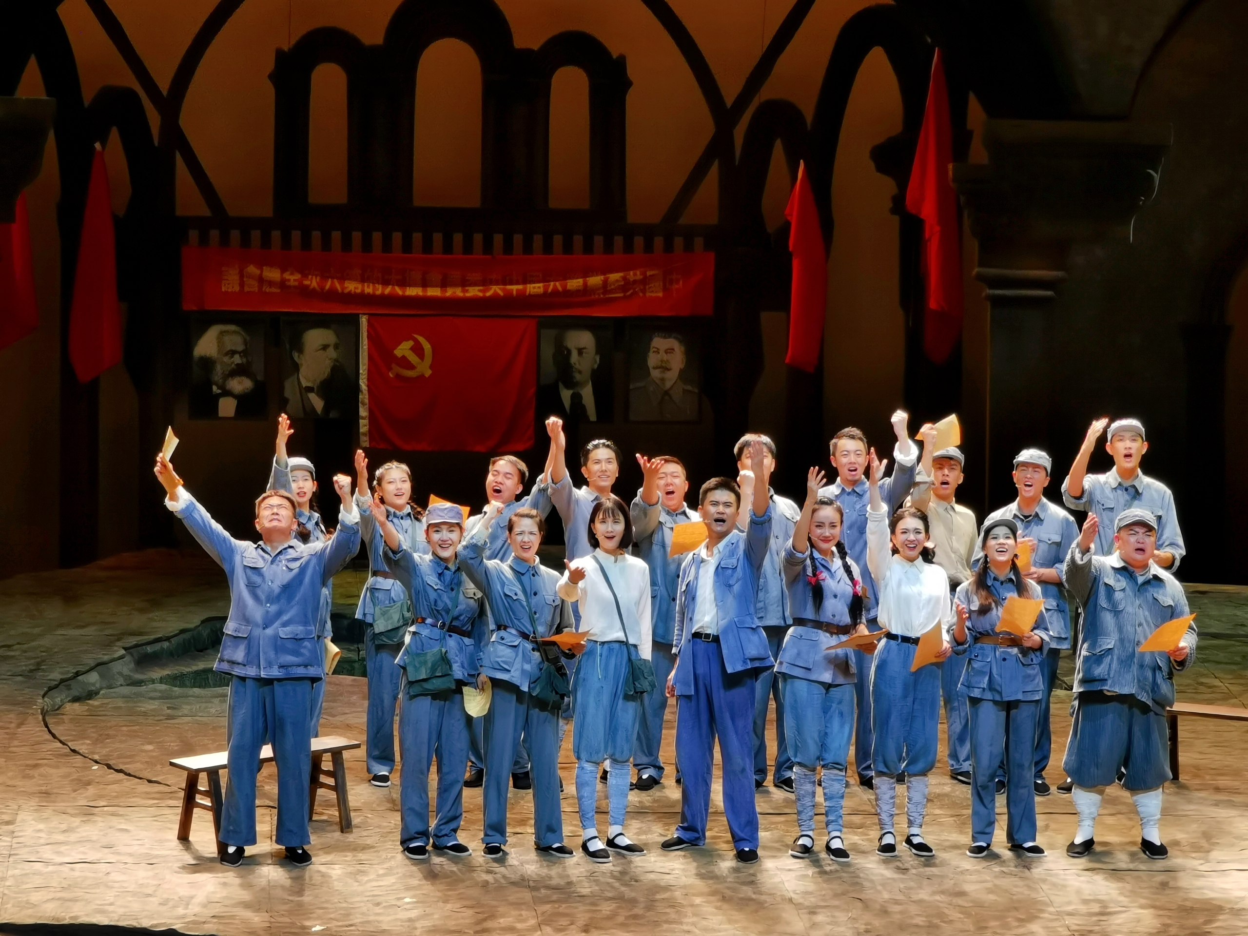 除此之外,该剧演出样式方面,恢弘大气、诗意盎然的舞台美术设计,坚实地承载着这一厚重的革命题材,充满着时代的气息与艺术的张力。演员方面则汇集了上海戏剧学院教师、校友,各院系本、硕、博学生以及上海话剧艺术中心、江苏省话剧艺术院等单位的优秀演员,因此,塑造出了一大批有血有肉、性格鲜明的人物形象。情感意蕴方面,悲喜交织,既有抗战热血激昂的呐喊,又有革命中的温情浪漫回响;既有催人泪下的悲情,又洋溢着喜剧的热情与朝气。