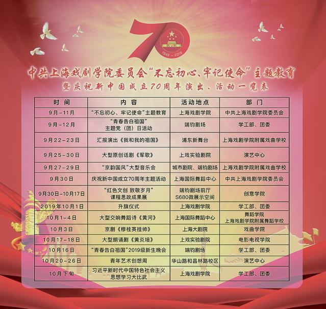 近期,我校为庆祝新中国成立70周年,并扎实推进“不忘初心、牢记使命”主题教育,也开展了一系列演出和活动,如大型原创话剧《军歌》、大型交响舞蹈诗《黄河》、京剧《穆桂英挂帅》、大型朗诵剧《黄炎培》、“红色文创 致敬岁月”课程思政成果展、“京韵国风”大型音乐会等。通过这些艺术作品的呈现和系列活动的举办,上戏力争用明德引领风尚,以精品奉献人民,用文艺凝聚起新时代奋勇前进的磅礴力量。(文、编辑:榕树 图:佳奇)