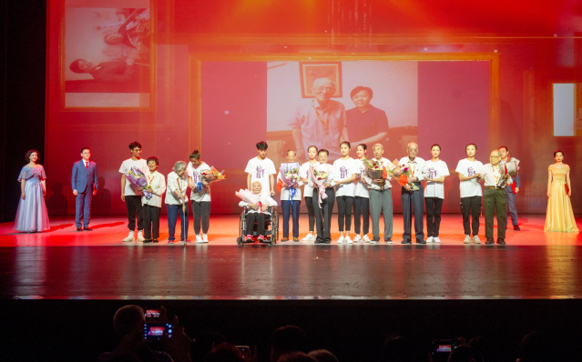活动的第一个环节是由学生代表向离休老同志代表敬献鲜花。此前,我校冯健、齐英才、张振民、吴耀宗、阮尚志、陈明、郭东篱、刘浩、冯少唐、丁丹英、陈加林、杨鲁欣等30位离休老同志已被授予了由中共中央、国务院、中央军委颁发的“庆祝中华人民共和国成立70周年”纪念章,以表彰他们为中华人民共和国成立作出的贡献。受上级委托,学校8位校领导及戏校、舞校领导于9月24日前分别专程上门慰问,为离休老同志逐一颁发纪念章并宣读贺信,向他们表达敬意与感谢之情。其中有2位老同志已逝世,也由他们的家属领取了纪念章。