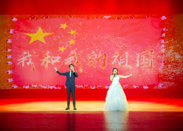 表演系教师宋颂和余笛现场演唱了歌曲《我和我的祖国》。在欢庆悦耳的旋律声中,舞台大屏幕播放了我校于今年5月联合各院系录制的《我和我的祖国》快闪活动MV视频画面,展现了上戏人对祖国最诚挚的祝福。
