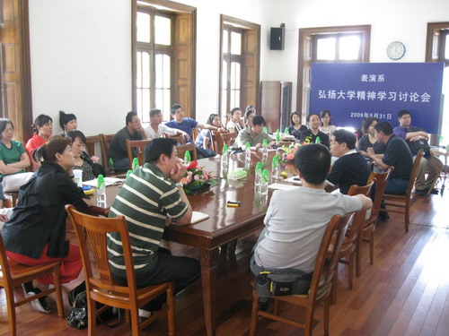 老师们纷纷展开讨论,王苏老师表示,我校师生因秉奉“真诚做人,认真演戏”的精神,刘婉玲老师表示“人类灵魂的工程师”应成为上戏所有教师所持的信条;肖英老师认为,“团结、创造、与时俱进”是属于上海戏剧学院的大学精神。在今后一段时间,表演系老师将继续展开大学精神的学习与讨论,为学院的科学发展贡献自己的力量。(原载表演系网页,图:光垒;文:陈莹;本网编辑:白水)