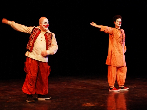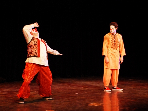 美国尔湾加州大学戏剧系发展学术研究及专业表演训练项目已有44年之久。目前,该系已拥有优秀的表演团体,良好的硬件设施,充满活力的学生团体以及杰出的校友。在不停地探索和研究各种社会、政治、文化现象的理论基础上,学校致力于发展戏剧表演,并积极开展各类学术活动。本次参演的剧目《各就位,叭!》由表演艺术家伊莱•赛蒙指导创作完成。该剧是由两个白脸小丑加上音、景相结合的剧目,它所要探讨的主题是关于禁忌的爱情、家庭的忠诚、生与死的抉择,取材自《罗密欧与朱丽叶》以及《高加索灰阑记》。该剧的舞台设计极为简单,仅有一把椅子,整场演出完全依靠演员的肢体动作和虚拟表情诠释演绎完成。在演出过程中,表演者还注重与现场观众的交流,而交流也是完全依靠肢体动作完成,夸张的表演,形象生动的声音模拟令在场的所有观众无不耳目一新。同时两个小丑身上分别承载着各种不同的角色,通过他们生动的表演引导观众产生共鸣和互动。据悉,这种小丑的表演艺术由伊莱•赛蒙所发展而来,他在03年出版的书籍《被揭开的面具》中曾经提及,并在其2009年出版的第二本书《小丑的艺术》中对小丑表演进行了更为详细的研究和介绍。