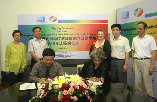 昨日中午,我校与印度国立戏剧学校合作交流签约仪式在佛西楼会议室举行,主持工作副院长韩生代表我校与印度国立戏剧学院代表Anuradha Kapur院长共同签署并交换了两校合作交流协议。校党委书记楼巍、副院长孙惠柱、外办主任金永林、外办主任助理张芸蕾共同出席了签约仪式。