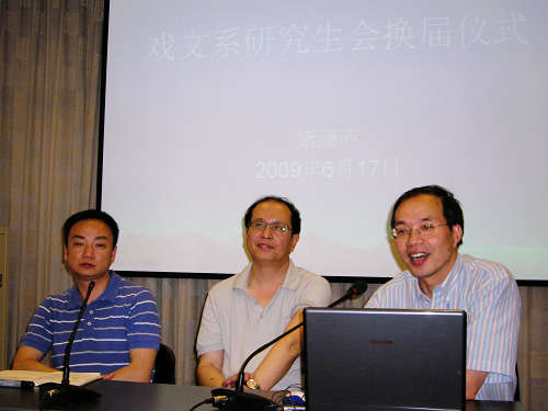 6月17日中午,戏文系研究生会换届仪式在紫藤庐召开,研究生部主任宫宝荣老师、戏文系副主任汤逸佩,以及戏文系刘庆、陆莉、朱晓珍等老师均出席了会议。会上老师们对研究生会一年多来取得的成果表示肯定和鼓励,并对同学们提出了新的希望,希望戏文系研究生会在刘庆老师的带领下,以饱满的热情投入到研究生的学生活动中来,多举办一些有特色、有效果的研究生学术交流活动。