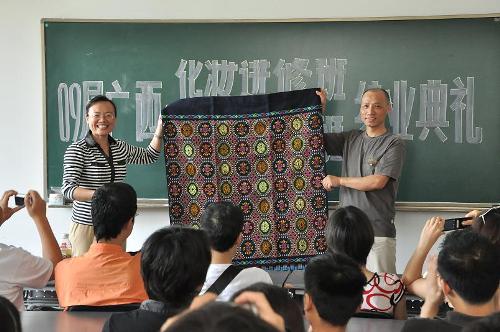 结业典礼上,各位任课老师发表了这一年来与进修班同学们相处的感言,并对各位学员表示由衷的祝福。学生代表发表结业感言,代表进修班的同学对舞美系老师的辛勤教诲表示衷心的感谢。陈映红副厅长代表广西壮族自治区文化界赠与我校一幅珍贵的壮锦,表示今后将与我校进一步合作,培养舞美人才,推动广西文化事业的发展。(文/图:林钰舒 编辑/雨田)