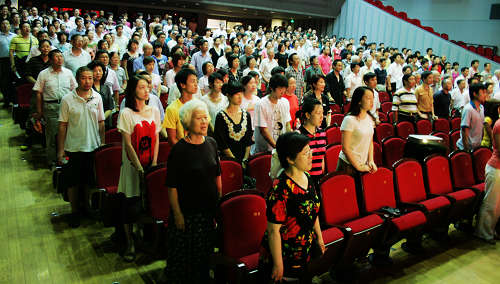 图为与会同志全体起立,高唱国歌